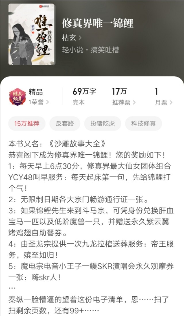 故事梗概加简评:主角弄了一条自带二维码的锦鲤…修真系统流,脑洞有点大,写的非常清新,看起来轻松愉快,不用费脑子的小说。