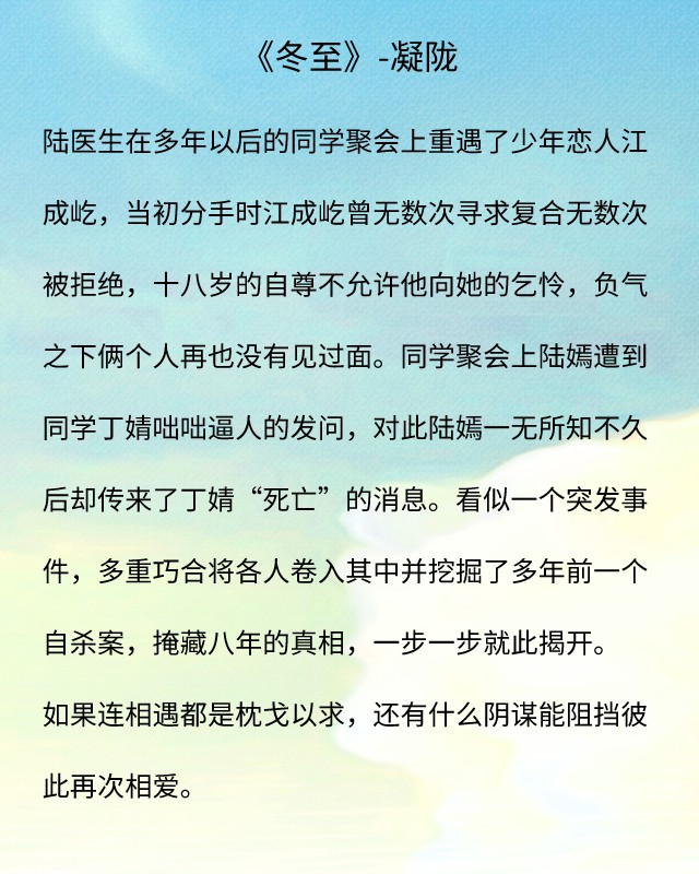 都市言情小说有很多分类,其中夹杂着悬疑剧情的更是极为精彩,比如我们刷了再刷的《冬至》。