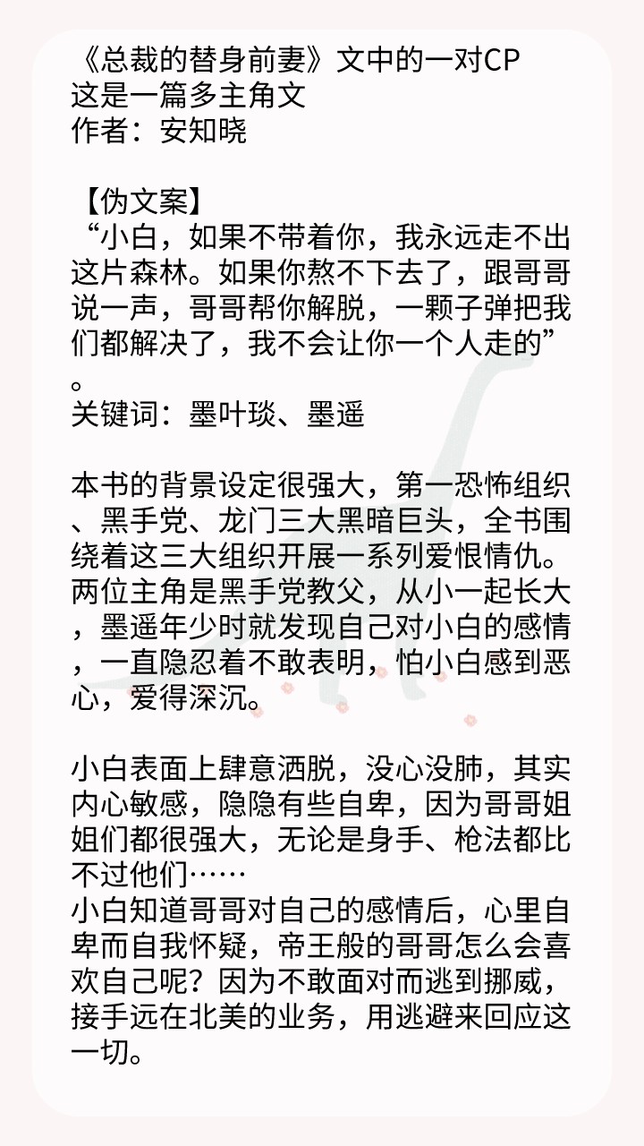 作者安知晓是写言情小说的,她的文基本上是多主角文,经典作是亿万系列,其中包含了《总裁的替身前妻》。我就是从这篇文入的坑,从此深似海啊。这篇剧情略狗血,但作者文笔幽默,人物个性鲜明,整体来说又甜又虐,值得一看!