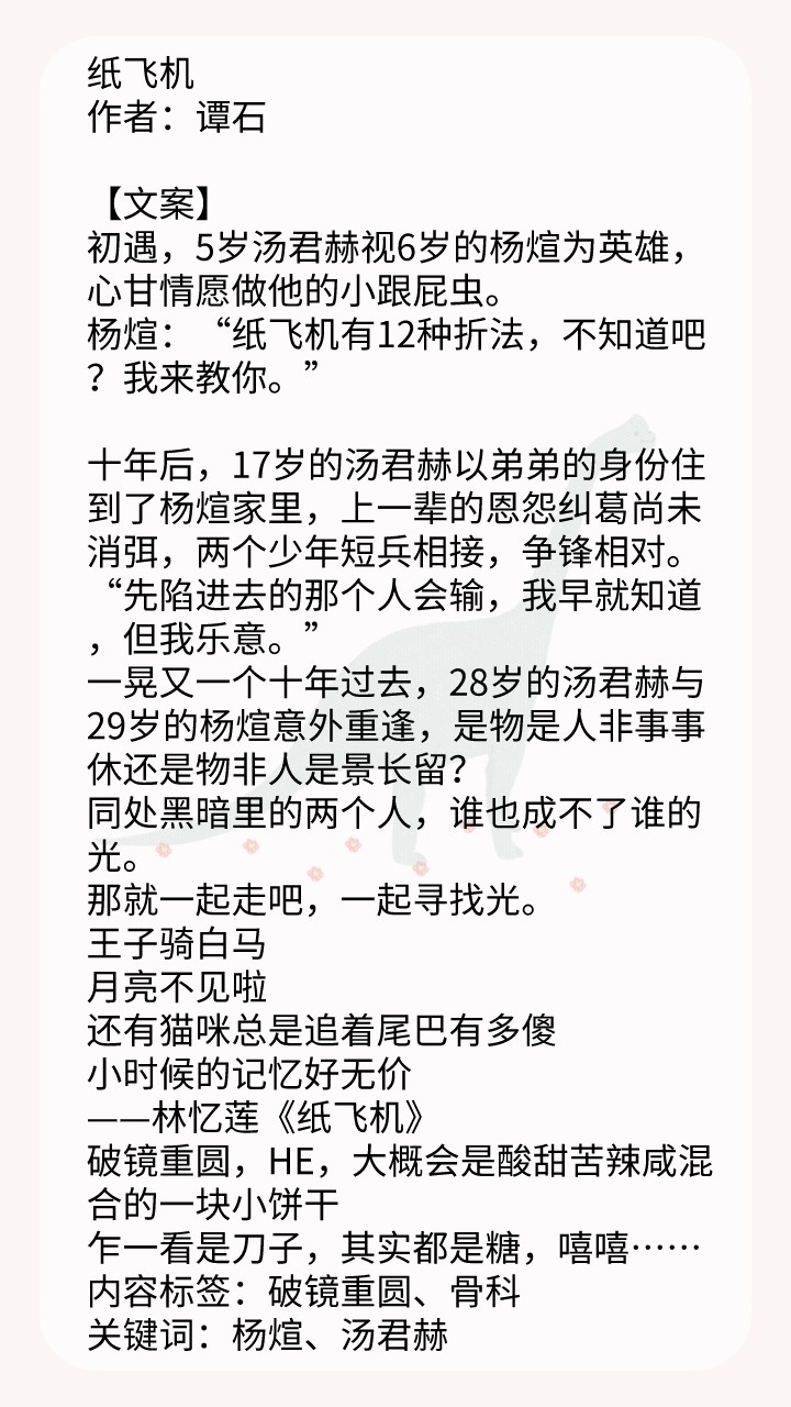 堪称经典纯爱骨科文《纸飞机》被很多人推荐过,但我还想推一遍,又甜又虐,文中的主要描写是在高中时期,哥哥杨煊爱得深沉,汤君赫爱得直白。十年后,因杨煊意外受伤,两人再次重逢….