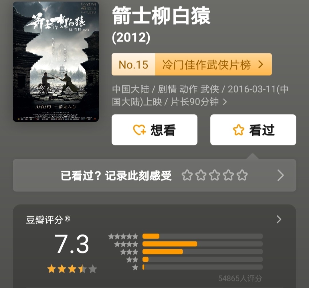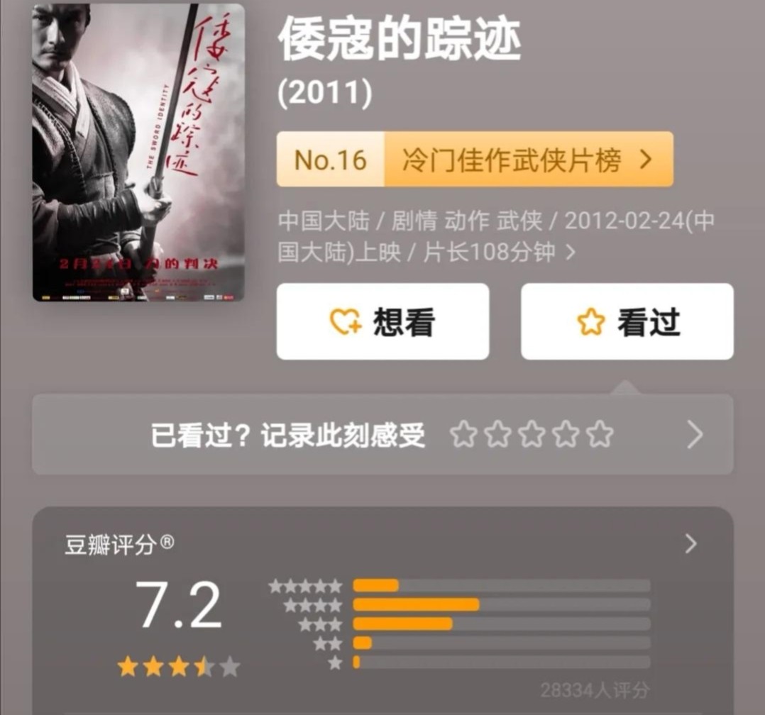 豆瓣评分至今为7.2,且位列冷门佳作武侠榜16。