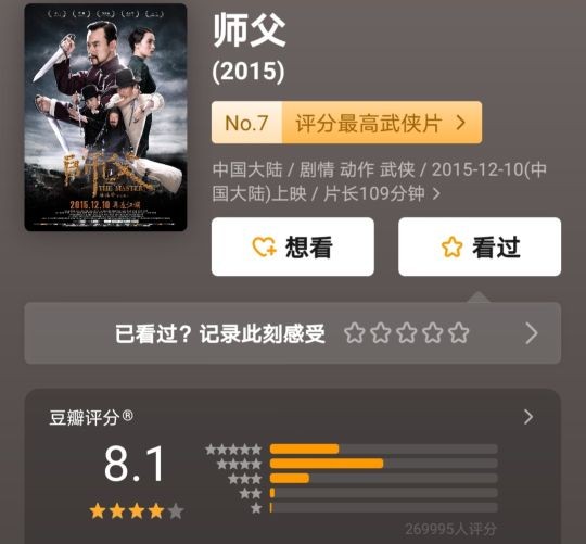 2015年12月,电影上映,获得业内一致好评,并取得包括金马奖在内的多项大奖,豆瓣评分高达8.1,高居武侠电影排行榜第七。