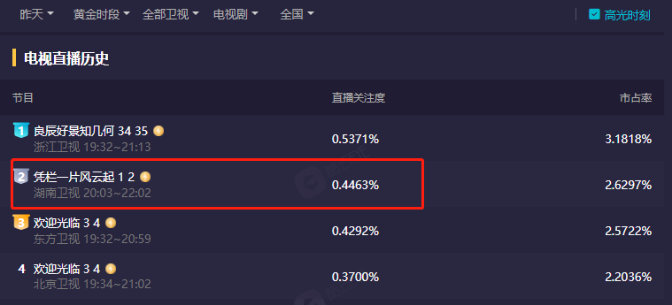 正午阳光推出的《相逢时节》扑街后,新作《欢迎光临》上线,同样是生活类的剧作,《欢迎光临》显然要比前作接地气得多。但剧作收视成绩并不理想,两大卫视同时播出,收视仅排在第三位和第四位,反倒是刚刚上线的《凭栏一片风云起》,在阵容不及《欢迎光临》的情况下收视第二。
