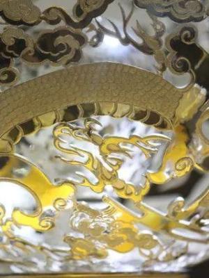 中国传统雕刻工艺。先把纹饰手工雕刻成型,葡萄酒单宁怎么读,然后用锉刀在器物表面锉出纹路,再用金箔(丝)铺在成型的器物上,通过高速撞击,让金箔(丝)嵌在网格中。