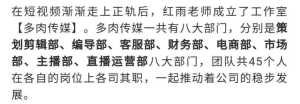 更可怕的是,在dy的一次创作者大会龙上,红雨曾经表示“多肉传媒一共有8大部门,团队共45人”↓