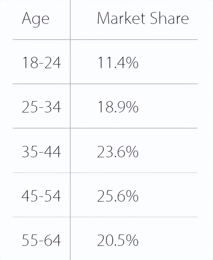 Statista数据显示,日本中老年这一消费群体为市场主力,远超年轻消费群体。其中,高龄组(55岁-64岁)的消费者比例高达20.5%。