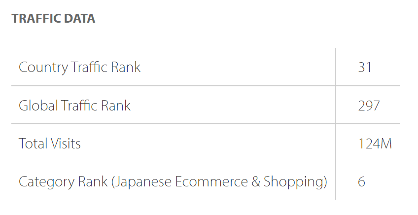 根据similarweb的1月份流量数据显示,Yahoo!Shopping的国家流量排名为第31,全球流量排名第297,总访问量为1.24亿次,日本电商品类排名为第6。