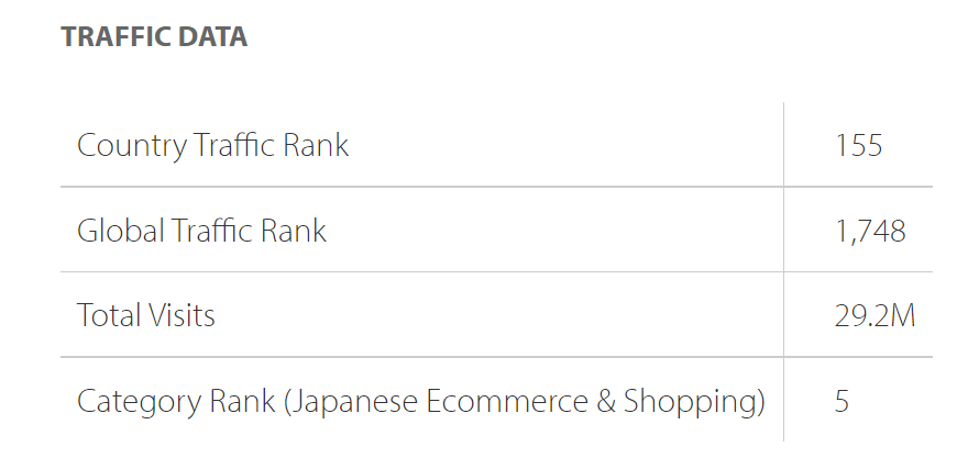 根据similarweb的1月份流量数据显示,Yahoo!Shopping的国家流量排名为第155,全球流量排名第1748,总访问量为2.92千万次,日本电商品类排名为第5。