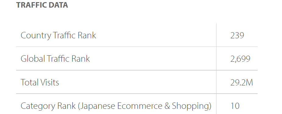 根据similarweb的1月份流量数据显示,Qoo10 Japan的国家流量排名为第239,全球流量排名第2699,总访问量为2.92千万次,日本电商品类排名为第10。