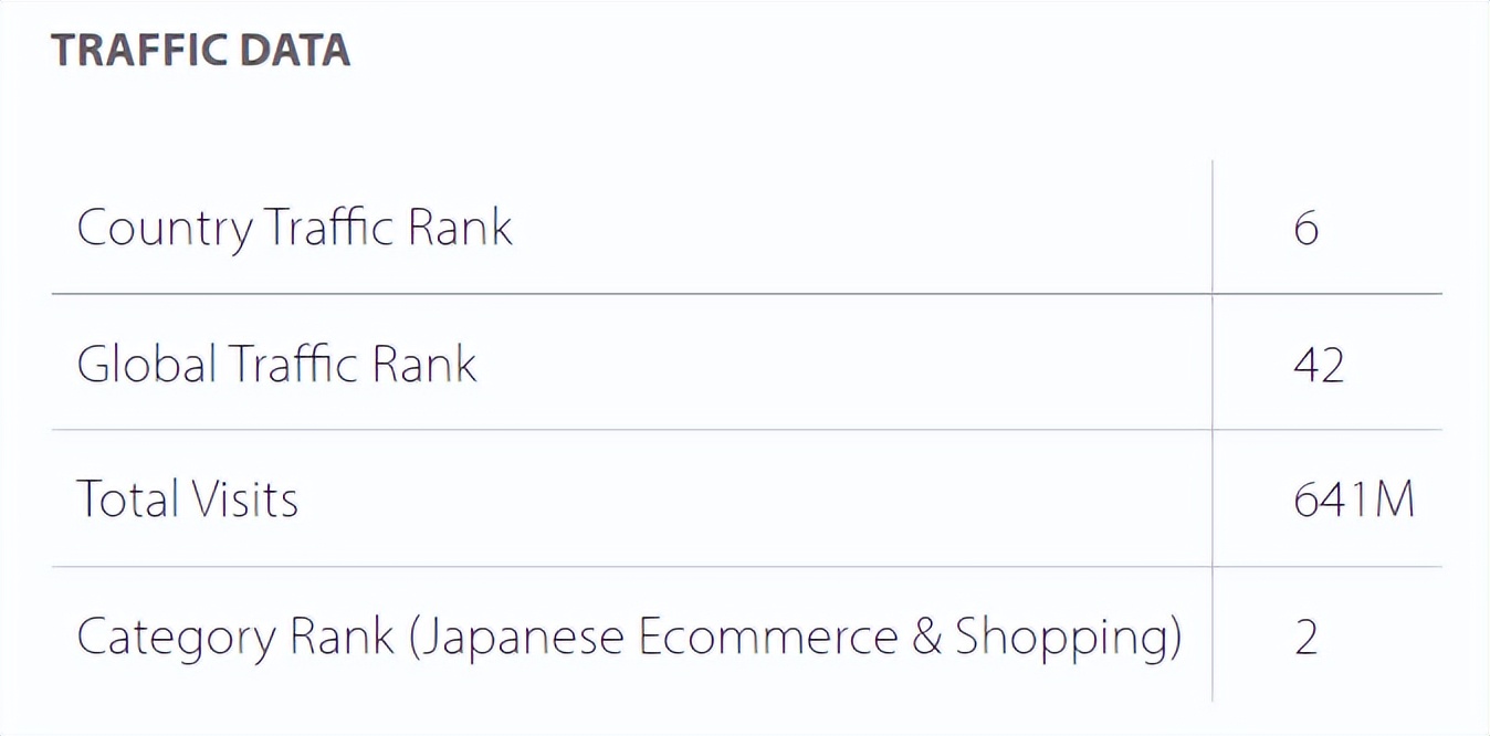 根据similarweb的1月份流量数据显示,亚马逊日本站国家流量排名为第6,全球流量排名第42,总访问量为6.41亿次,日本电商品类排名为第2。