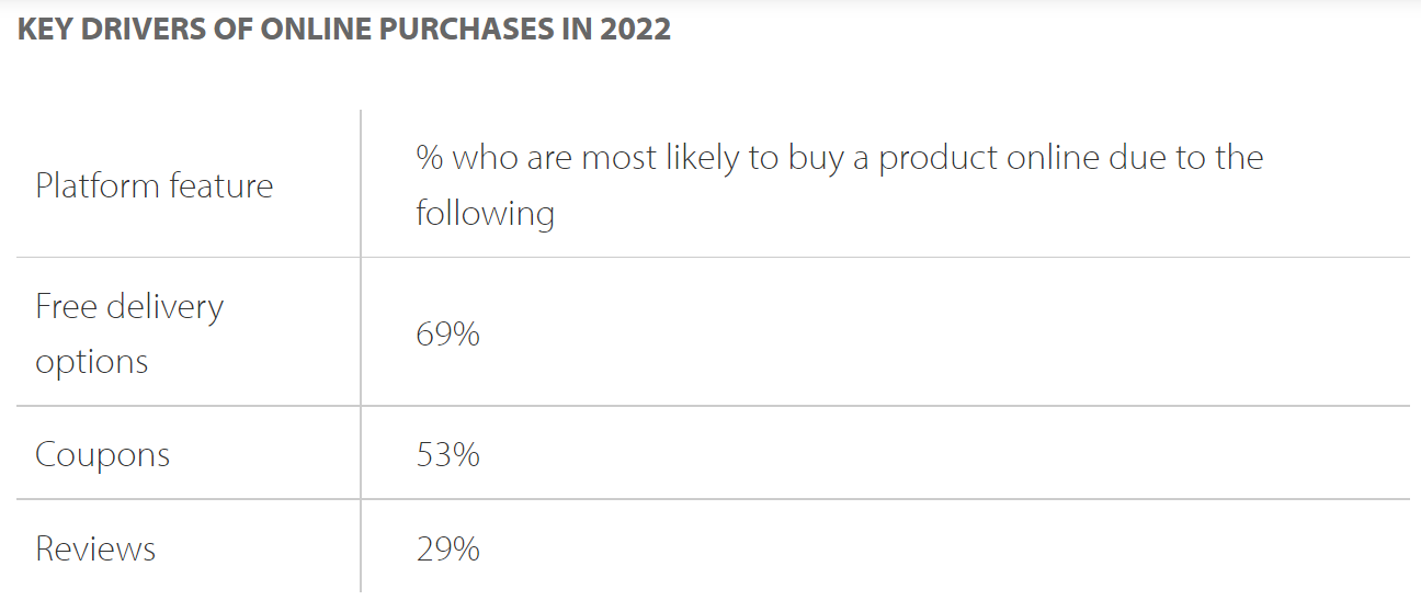 GWI消费者数据显示,电商平台提供的服务中,最能吸引日本线上消费者下单的三大因素:包邮(69%)、折扣(53%)、评价(29%)。