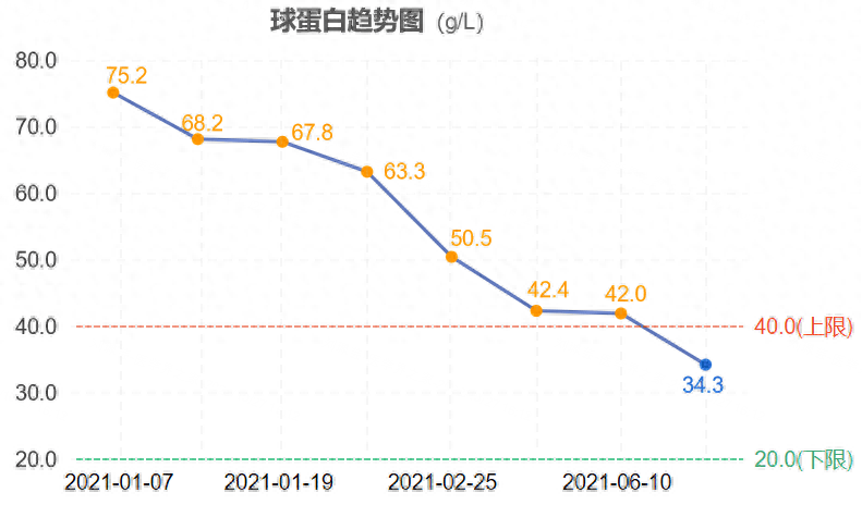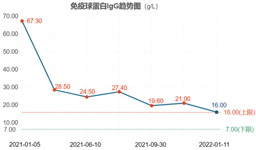 免疫球蛋白:球蛋白及IgG水平随治疗时间的延长而持续降低,目前已恢复正常(图1);